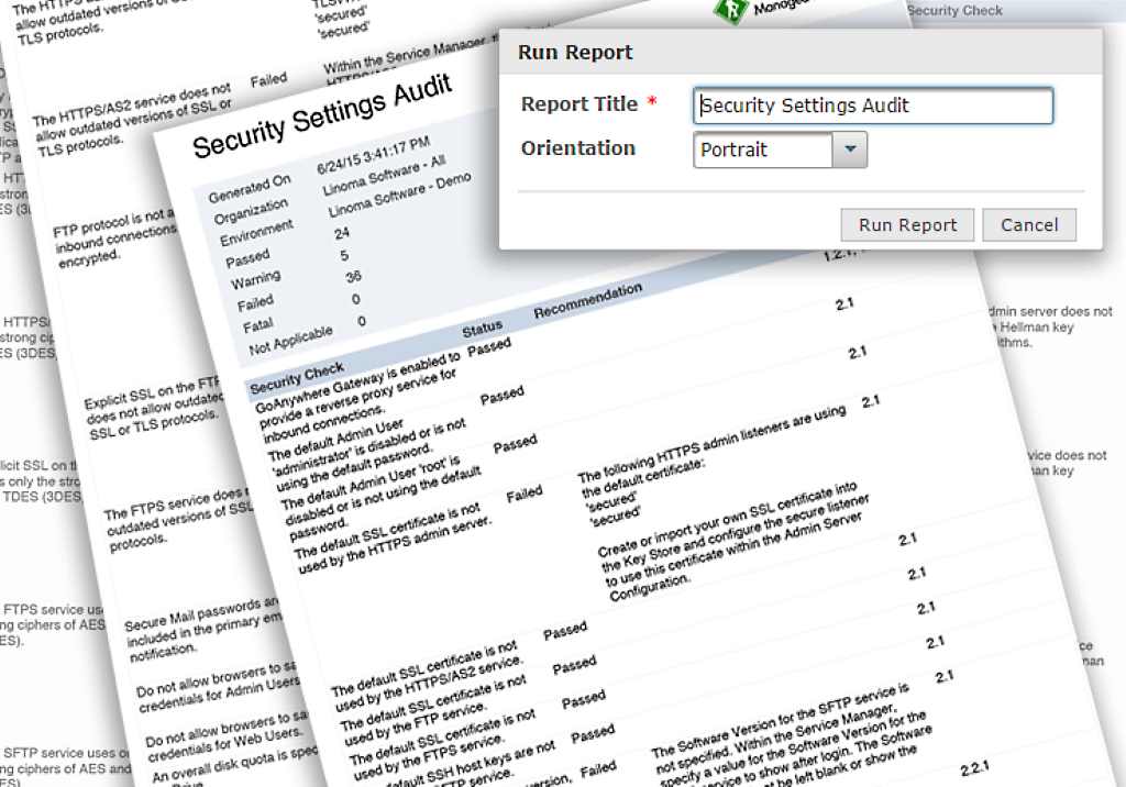 Security SettingsAudit – zeigt kritische Sicherheitseinstellungen für die Einhaltung des Payment Card Industry Data Security Standard (PCI DSS) an. GoAnywhereMFT unterstützt mehr als 60 relevante Sicherheitseinstellungen